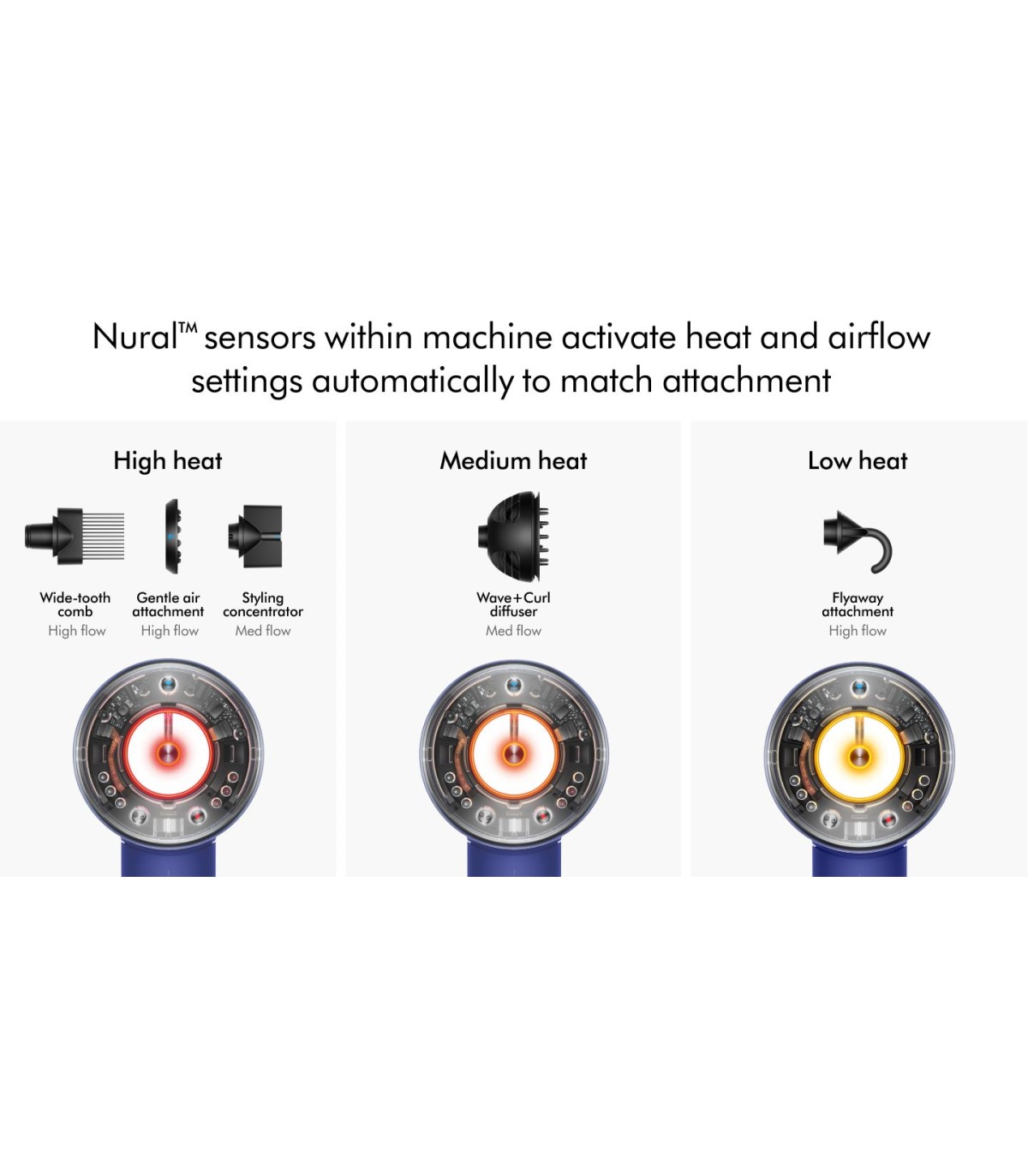 سشوار Dyson Supersonic Nural HD16 محصولی با مجموعهای از سنسورهاست که به طور خودکار جریان هوا و دما را تنظیم میکند تا درخشش طبیعی موها را افزایش داده و از سلامت پوست سر محافظت کند.