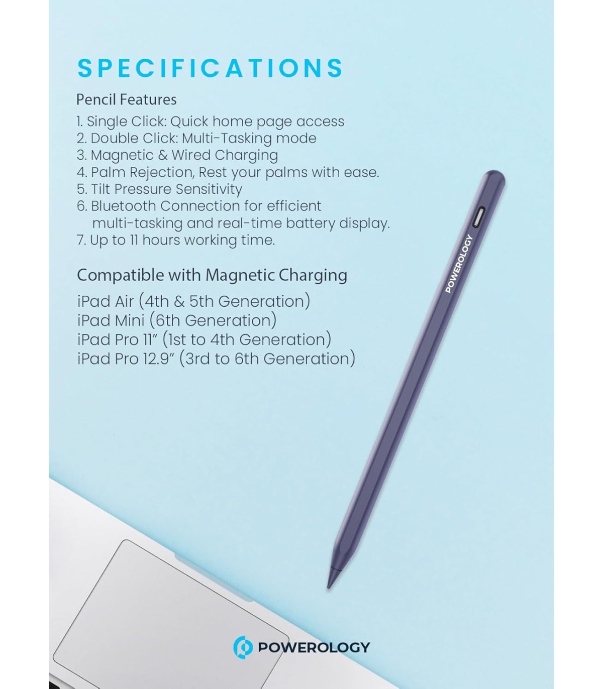 - قلم Powerology با نوک دقیق ۱.۵ میلیمتری، مناسب برای آیپدهای ۲۰۱۸ تا ۲۰۲۲