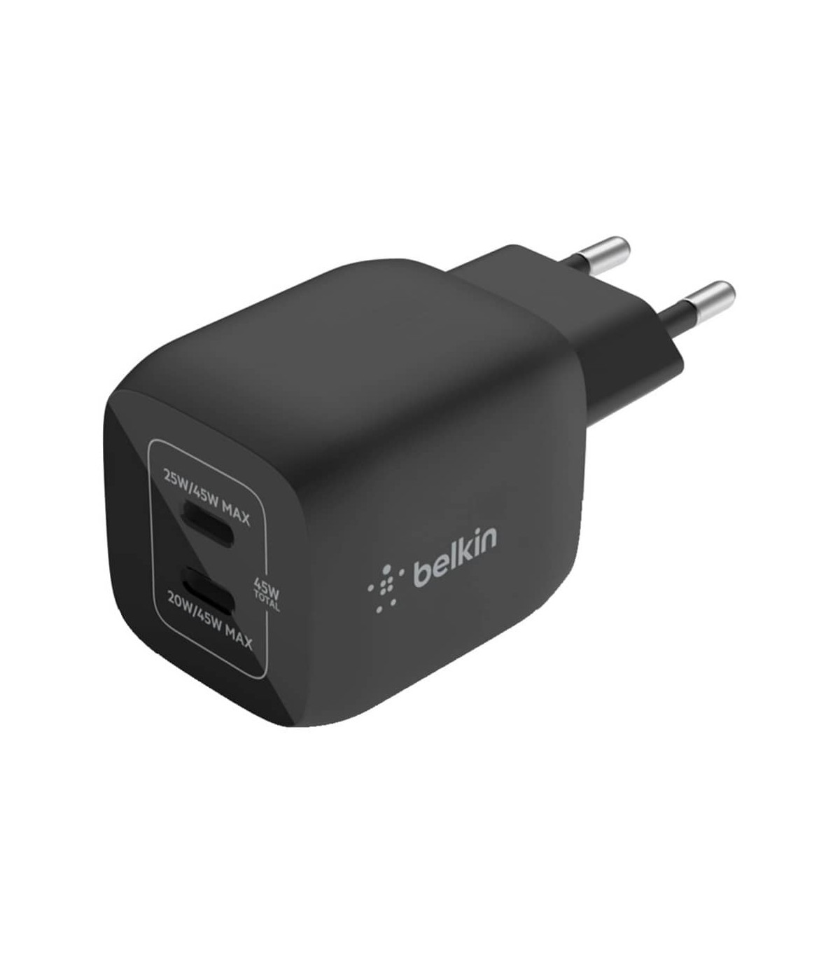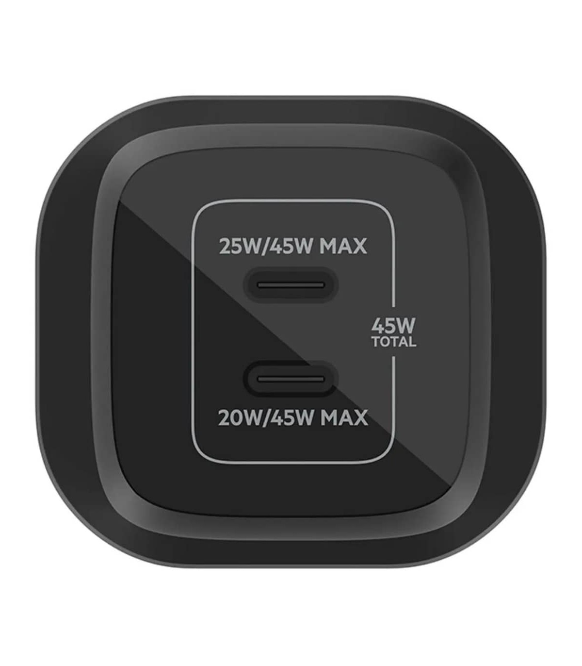 این مدل از شارژرهای Belkin به دو درگاه USB-C مجهز شده که میتوانند بهصورت همزمان دو دستگاه را شارژ کنند. وقتی فقط از یکی از پورتها استفاده شود، دستگاه میتواند حداکثر ۴۵ وات توان ارائه دهد، که برای شارژ سریع لپتاپهایی مانند مکبوک ایر، آیپد پرو، گلکسی تب و بسیاری از گوشیهای پرچمدار کاملاً مناسب است. اگر هر دو پورت همزمان استفاده شوند، توان بهصورت هوشمند تقسیم میشود (۲۰W + ۲۵W) که باز هم برای شارژ همزمان یک گوشی و یک تبلت یا هدفون عالی است.