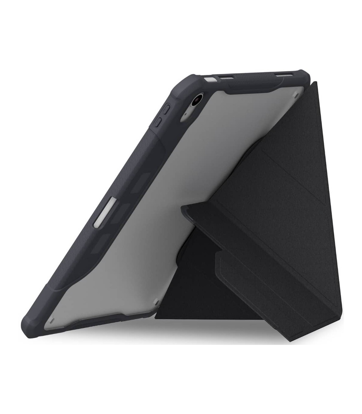 پوشش خارجی این کاور ضد خش بوده و در برابر لکههای چربی و اثر انگشت مقاوم است. همچنین فریم محافظ لنز دوربین در این کاور طراحی شده تا از خراش و آسیبهای احتمالی به دوربین آیپد جلوگیری کند.