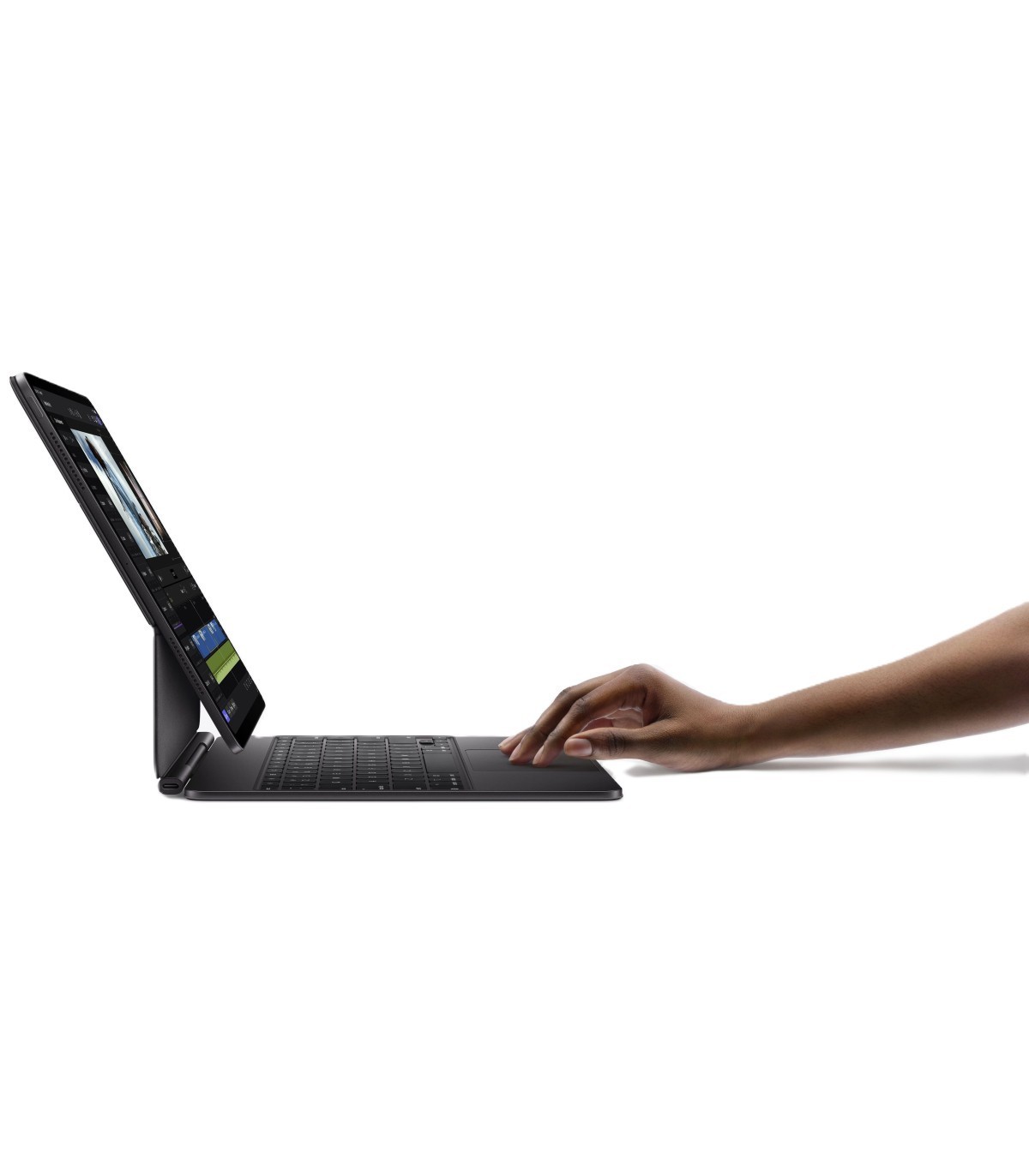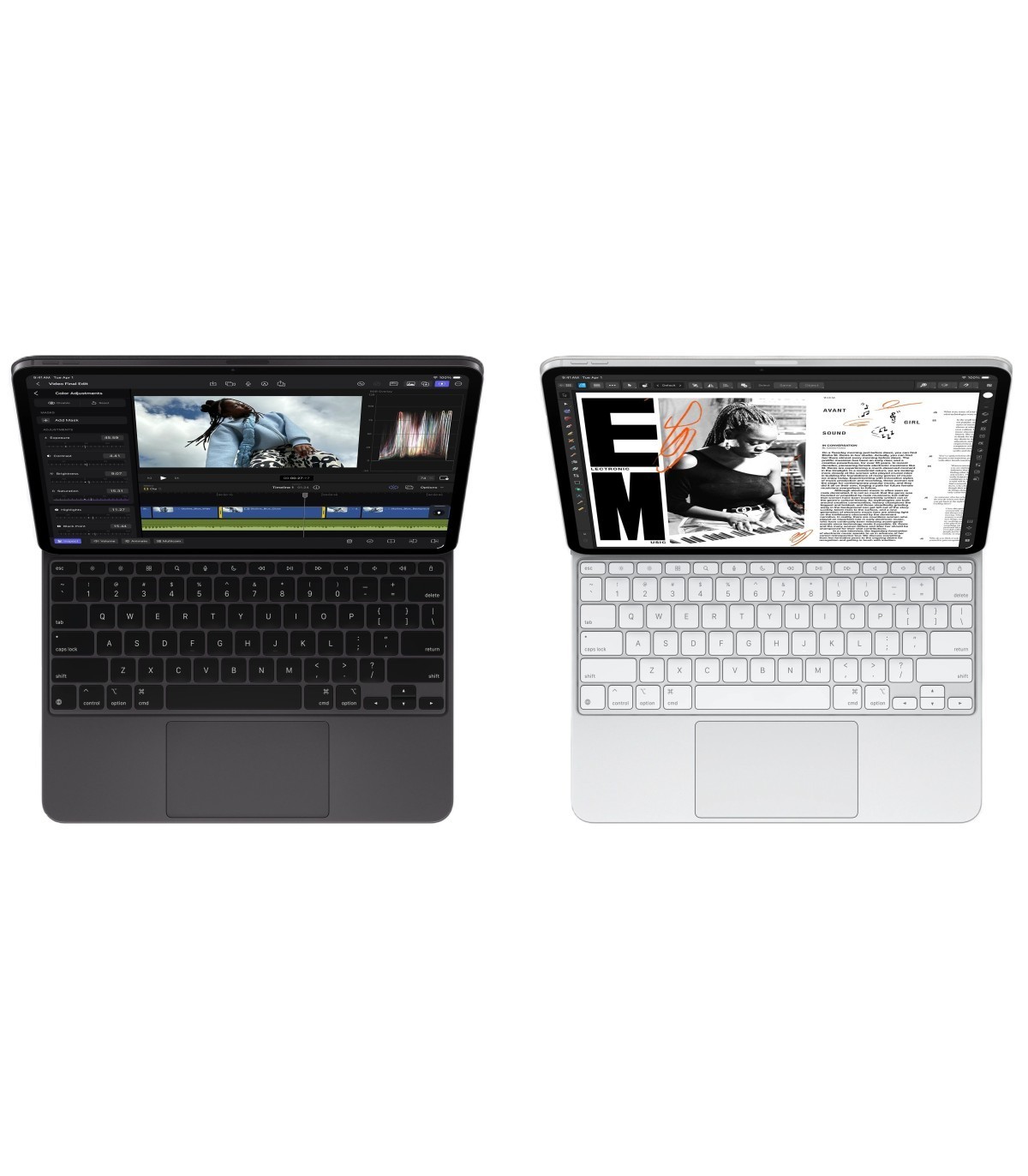 یکی از پرطرفدارترین لوازم جانبی آیپد پرو بعد از قلم، کیبورد مغناطیسی این محصول است که با نام مجیک کیبورد شناخته میشود. مجیک کیبورد در ظاهر شبیه به یک قاب آیپد با قابلیت استند است. اتصال آیپد پرو M5 و مجیک کیبورد نیز از طریق پینهای پشت بدنه و با حالت آهنربایی انجام میشود. پس از اتصال، آیپد پرو بیشتر شبیه به یک لپتاپ جمع و جور خواهد بود. قرارگیری معلق آیپد با لولاهای محکم فلزی، تعادل عالی و کیفیت ساخت بالا فقط از دست اپل برمیآید. یک کیبورد با کیفیت به همراه نور پسزمینه (Backlight)، ترک پد (تاچپد) و یک درگاه USB-C اضافه برای شارژ کردن همزمان از ویژگیهای برجسته مجیک کیبورد برای آیپد پرو هستند. اگرچه، باید توجه داشته باشید که این محصول تنها با مجیک کیبورد آیپد پرو M4 سازگار است که بدنهای فلزی دارد و نمیتوان از آن با نسخههای قدیمیتر مجیک کیبورد استفاده کرد.