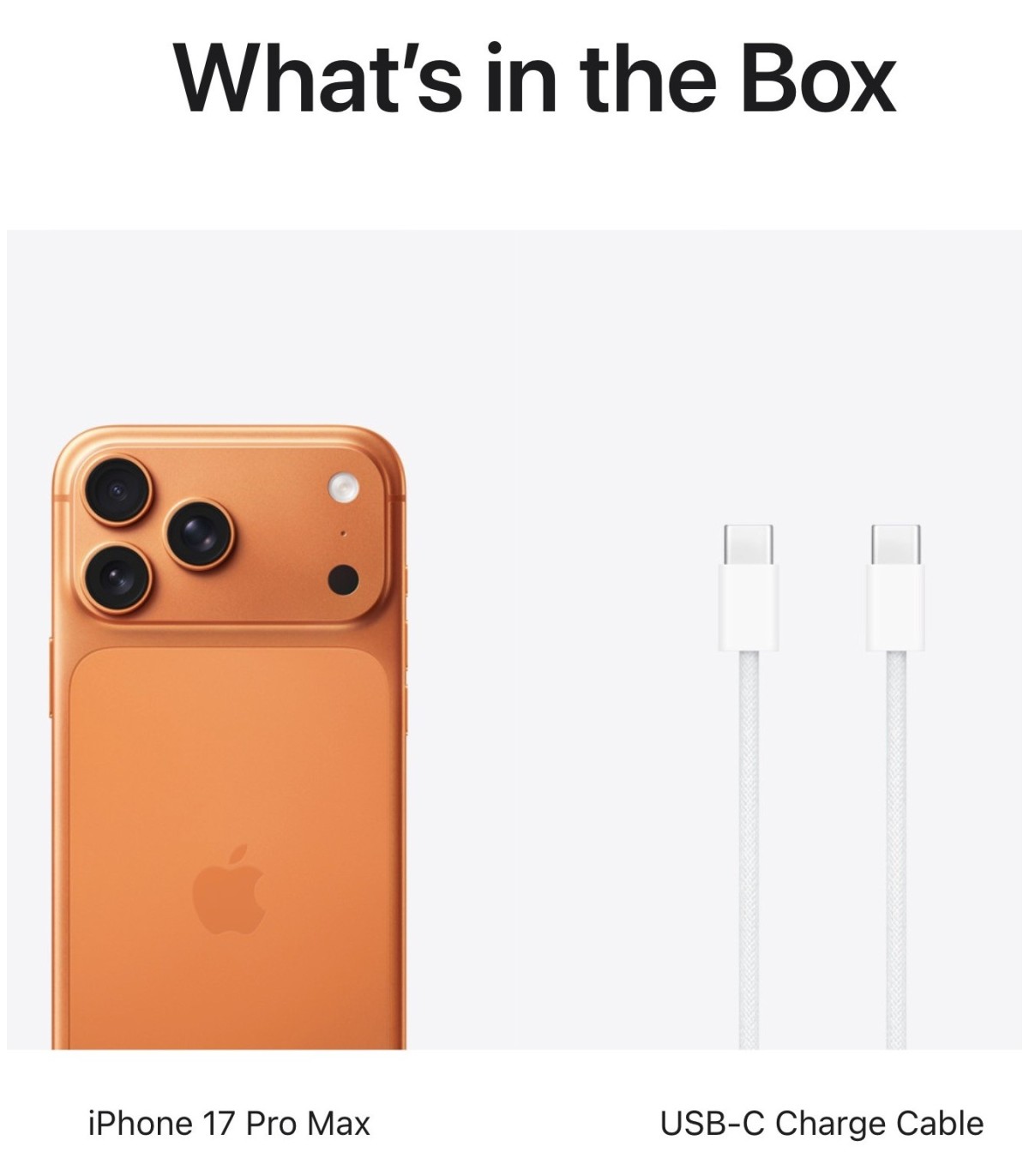 برای شارژ کردن آیفون ۱۷ پرومکس میتوان از آداپتور ۲۰ وات اپل استفاده کرد. اما برای تجربه شارژ سریع نسل جدید اپل (فست شارژ ۵۰ درصد در ۲۰ دقیقه) باید از آداپتور ۴۰ وات داینامیک اپل یا هر آداپتور استاندارد دیگر با حداقل توان ۴۰ وات استفاده کرد. کابل موجود در بستهبندی آیفون ۱۷ پرومکس برای شارژ سریع نسل جدید مناسب است چرا که قابلیت انتقال حداکثر توان ۶۰ وات را دارد. اگرچه انتقال اطلاعات با این کابل بسیار کند انجام میشود و بهتر است نسبت به خرید کابل تایپ سی USB3 یا تاندربولت اقدام کنید.