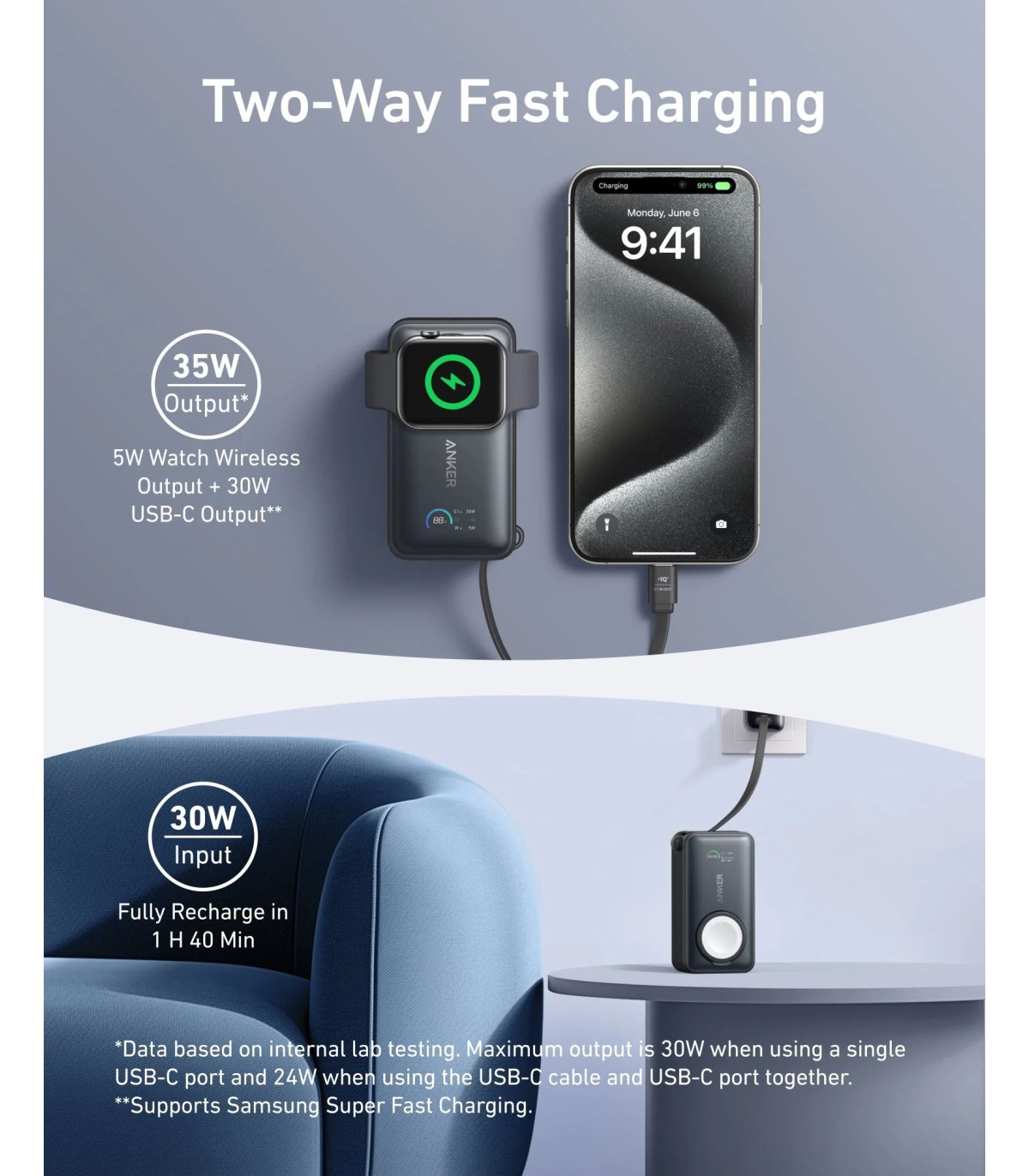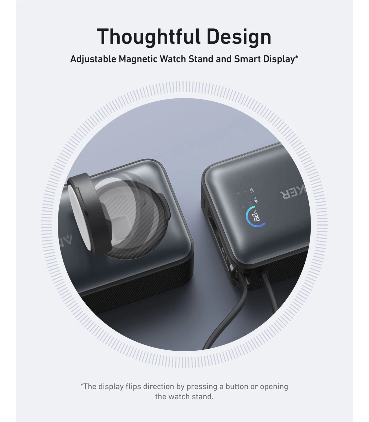 توان خروجی این پاوربانک ۳۰ وات از طریق USB-C است که امکان شارژ سریع انواع دستگاههای سازگار را فراهم میکند. علاوه بر این، ۵ وات توان اختصاصی برای شارژ اپل واچ نیز در نظر گرفته شده است که به کاربران امکان میدهد بدون نگرانی از کمبود شارژ، دستگاههای خود را بهطور همزمان شارژ کنند.