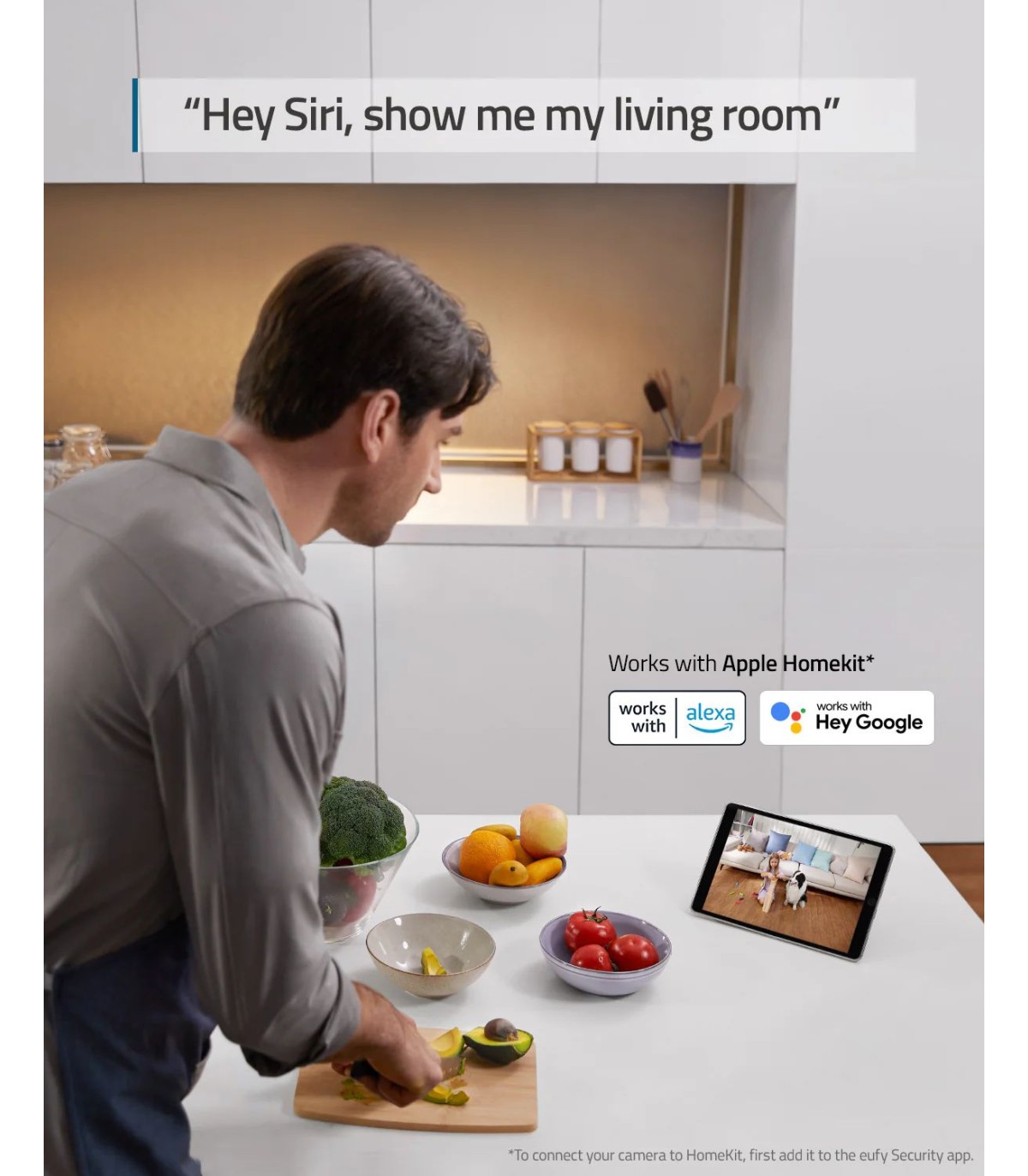 کنترل هوشمند: این دوربین با دستیارهای صوتی گوگل، الکسا و Apple HomeKit سازگار است و میتوانید با استفاده از دستورات صوتی، دوربین را کنترل کنید (راهنمای کاربری HomeKit در بخش اطلاعات محصول قابل دانلود است).
