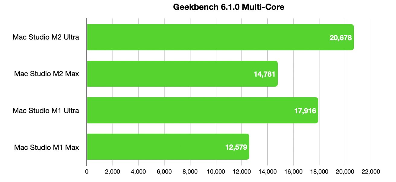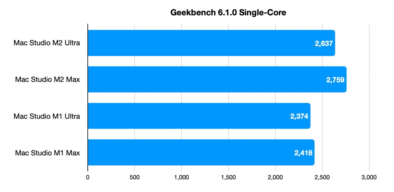 برای بنچمارک و مقایسه کارایی مدل M2 با نسل قبلی از Geekbench 6.1 استفاده شدهاست. همانطور که انتظار میرود در حالت تکهسته، کارایی M2 کمی از M1 بیشتر است.