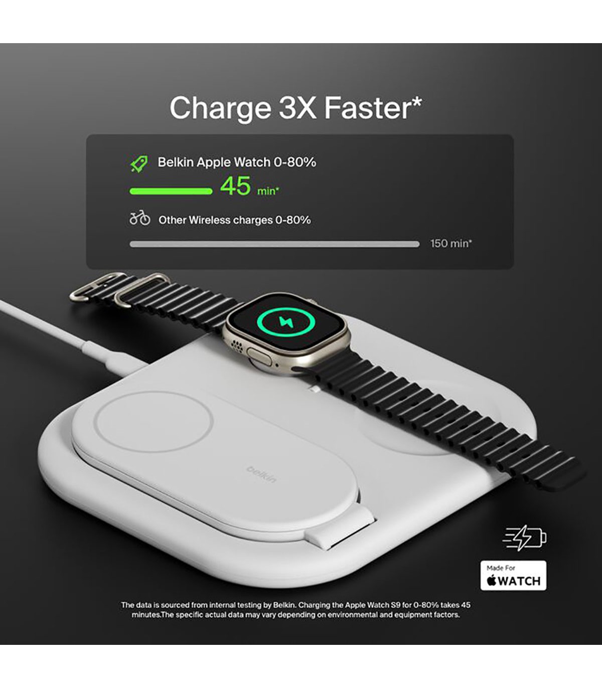 یکی از بزرگ‌ترین مزیت‌های این مدل، توان ۱۵ وات واقعی برای شارژ آیفون است. برخلاف بسیاری از پدهای بی‌سیم که ادعای سرعت بالا دارند اما خروجی واقعی آن‌ها کمتر از ۱۰ وات است، این محصول با استاندارد Qi2 و مگنت دقیق توان را بی‌وقفه به گوشی منتقل می‌کند. اپل واچ سری ۷ تا اولترا ۲ نیز با حالت Fast Charge اختصاصی بلکین تا ۸۰ درصد تنها در ۴۵ دقیقه شارژ می‌شود؛ یعنی دقیقاً همان تجربه شارژی که اپل در آداپتورهای اصلی خود ارائه می‌دهد.