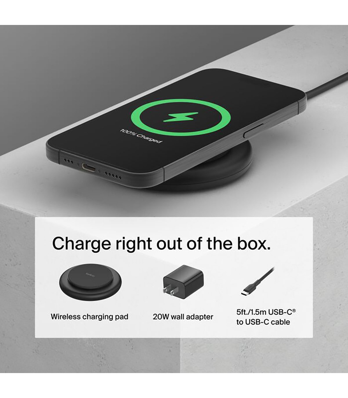 این پد شارژ شامل همه لوازم مورد نیاز برای استفاده فوری است. منبع تغذیه ۲۰ وات و کابل USB-C به USB-C به طول ۱.۵ متر. این یعنی شما میتوانید فوراً دستگاه خود را شارژ کنید و نیازی به خرید لوازم جانبی اضافی ندارید. همچنین طراحی سبک و جمعوجور پد، امکان قرار دادن آن روی میز کار، کنار تخت یا هر مکان دیگر را فراهم میکند. شما میتوانید به راحتی دستگاه خود را بردارید و دوباره روی پد قرار دهید، بدون نگرانی از افتادن یا حرکت آن.